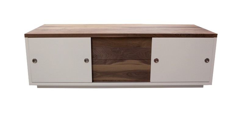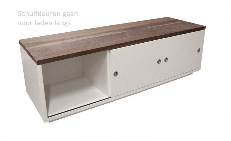 Dit audio-tv-meubel heeft een massief notenhouten bovenblad van 30mm dik. Wordt ook geleverd met blad van eikenhout of kersenhout. De rest van het meubel is in RAL 9001 uitgevoerd. Een andere kleur is ook mogelijk.