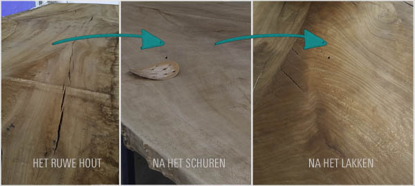 Na vele uren werk is de tafel eindelijk klaar. Deze tafel is zo groot dat hij niet machinaal te bewerken is. Daarnaast zouden we door de glooiingen in het blad zoveel dikte wegschuren als hij door de machine zou gaan. Kwam dus neer op dagenlang met de handschuurmachine over het blad gaan. Alle groefjes van de grote lintzaag wegschuren, sommige enkele millimeters diep. Na het schuren was de mooie warme kleur bijna weg, maar met de juiste blanke lak konden we de kleur weer helemaal ophalen.