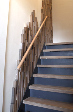 Van de vele kleine reststukjes eikenhout zijn kratten vol blokjes van diverse breedtes en lengtes gezaagd, welke in verschillende kleuren olie gezet zijn.