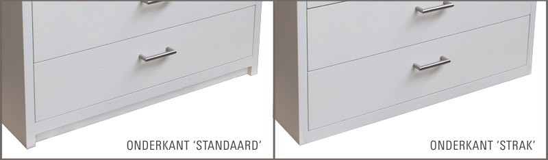 De onderkant van de kast kan op twee manieren worden afgewerkt. De standaarduitvoering heeft een iets terugvallend plintje. Het is ook mogelijk de kast helemaal strak te laten uitvoeren. Zie ook de foto.