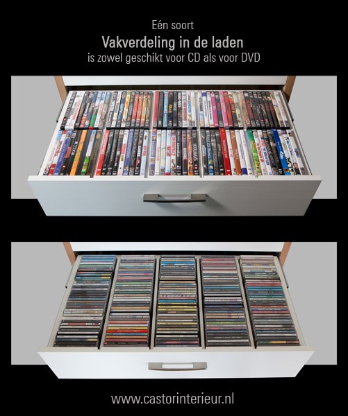 Deze ladekast voor CD's of DVD's is de ideale manier om uw verzameling stofvrij, en op een compacte manier op te bergen. Vanzelfsprekend kunnen de laden volledig uitgeschoven worden, zodat ook de achterste cd zonder moeite te bereiken is. De maatvoering is volledig geoptimaliseerd voor het opbergen van CD's zonder dat er ruimte verspild wordt. DVD's passen er ook perfect in, in twee rijen achter elkaar van links naar rechts.
