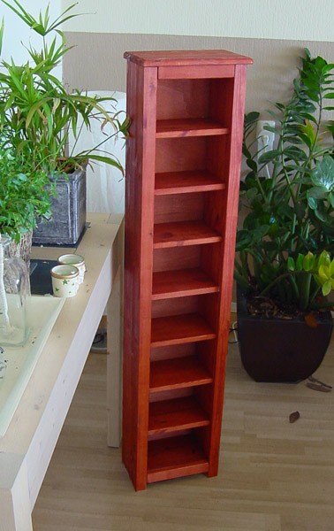 De kast heeft 30 mm massief houten wanden, dus geen holle lijsten waar de cd's achter kunnen vallen. Je kunt dus ook de eerste paar cd's pakken zonder eerst een stapel uit de kast te hoeven pakken. Er passen 20 cd's in een cd-vak. Ook leverbaar als kast voor DVD's.
