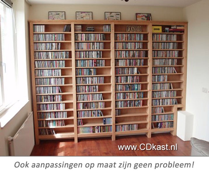 Ook deze kast kunnen wij op maat maken. Wij maken ieder meubel op bestelling, en het maakt voor ons niet uit of dit een standaardmaat of een afwijkende maat is. Vandaar dat bij ons maatwerk niet duurder is dan een standaardmaat. Kies zelf het aantal vakken boven elkaar, het aantal vakken naast elkaar, de kleur, de indeling, en maak ook een combinatie van CD, DVD en Blu-ray in één kast.