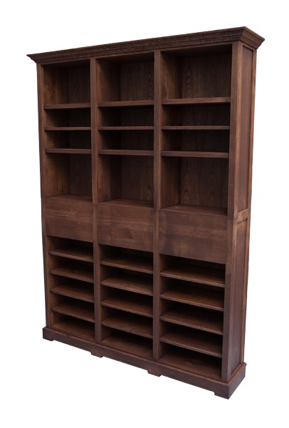 Het cd-gedeelte van deze kast biedt plaats aan 900 cd's. In het midden 3 greeploze lades van ongeveer 25 cm hoog. Er zijn dikkere schappen voor de boeken, om doorbuigen te voorkomen.