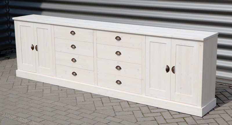 Standaard uitgevoerd met 8 laden en 4 deuren, op ook volledig op maat te maken. Achter de deuren zit een plank. Gemaakt van massief duurzaam rubberwood.