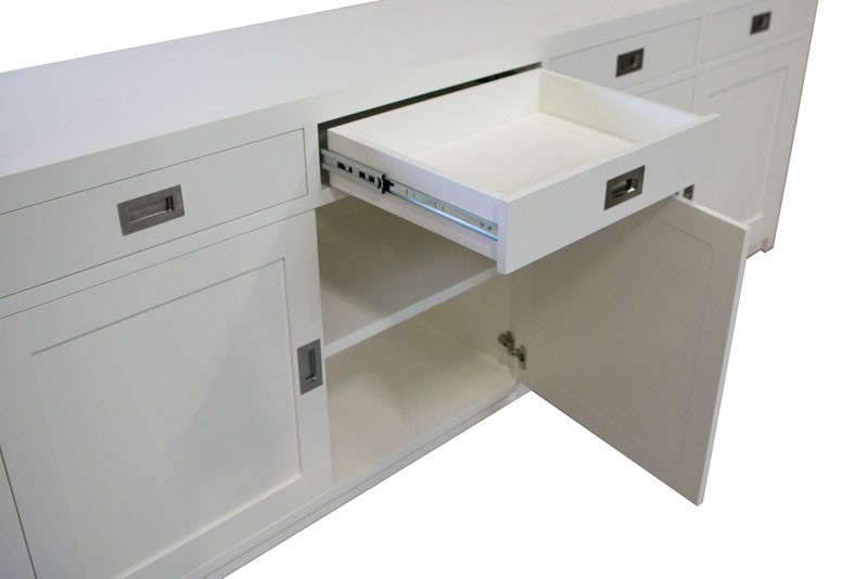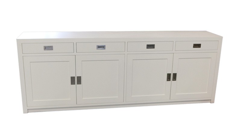 Geheel gemaakt van massief hout. Standaard uitgevoerd met 4 laden en 4 deuren, op ook volledig op maat te maken. Achter de deuren is een extra schap geplaatst, waarmee de hoogte in twee vakken verdeeld wordt.