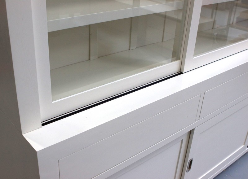 Deze strakke kast heeft 3 dichte schuifdeuren onderin, 3 laden daarboven, en 3 schuifdeuren met glas bovenin. De bovenkant is 35 cm diep. Het onderste gedeelte 45 cm.