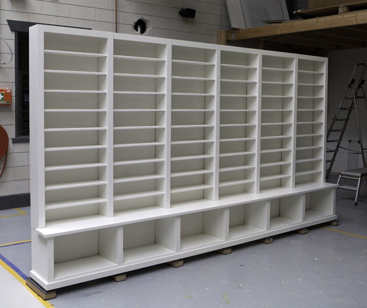 Deze platenkast heeft 6 vakken naast elkaar. Ook andere vakverdelingen zijn mogelijk. De prijzen zijn inclusief afwerking in een kleur naar keuze.