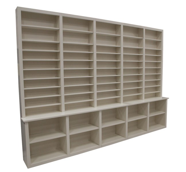 Deze platenkast heeft 5 vakken naast elkaar. Ook andere afmetingen zijn mogelijk, bijvoorbeeld een uitvoering met twee vakken, drie vakken of vier vakken naast elkaar.