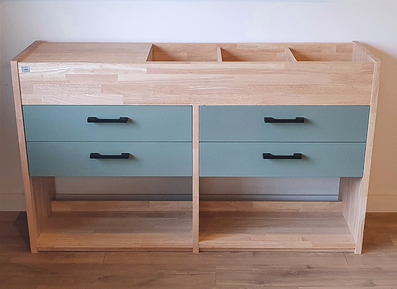 Het meubel is gemaakt van duurzaam rubberwood, grotendeels afgewerkt in naturel lak, de laden hebben een accent-kleur.
