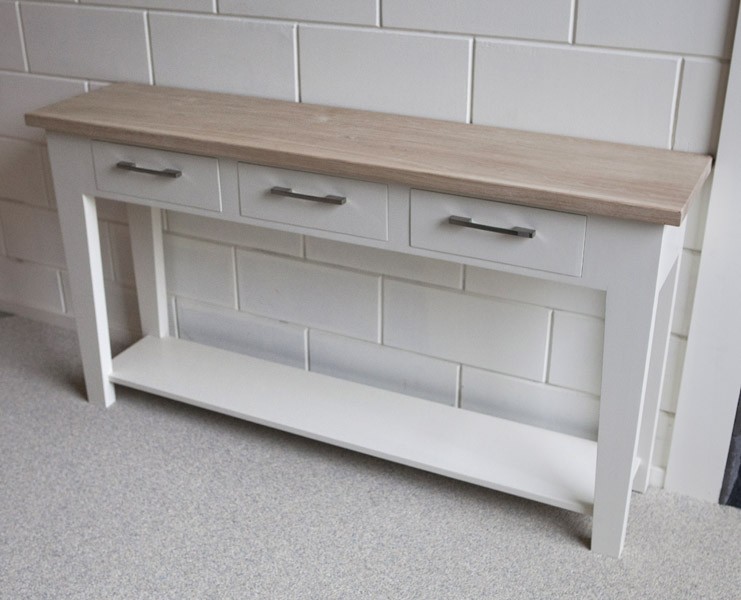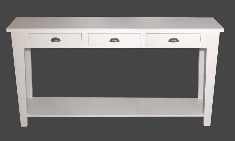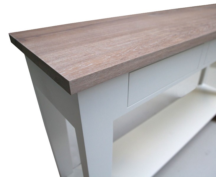 Fraaie combinatie van modern en klassiek. Het bovenblad is van massief 30 mm dik massief rubberwood of eikenhout. Uitgevoerd met taps toelopende poten, een legplank en een aantal laden, afhankelijk van de maat van de sidetable.