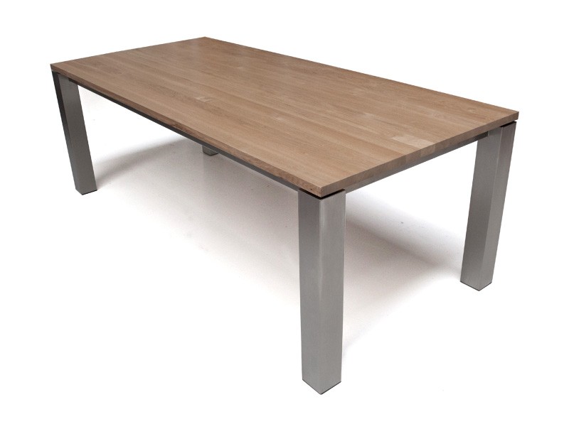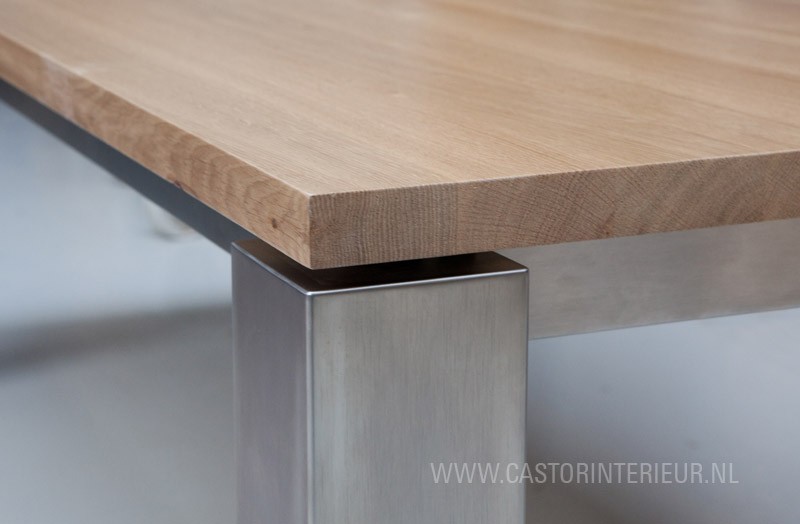 Zeer degelijk uitgevoerde tafel met een frame van RVS en een massief eiken tafelblad. Standaard wordt de tafel geleverd in een mooi gladde kwaliteit eikenhout, maar op verzoek is de tafel ook leverbaar met een rustiek blad. Dit wil zeggen dat het hout een mooie natuurlijke tekening heeft, en scheuren en noesten kan bevatten. We kunnen dit model ook leveren met een houten blad van notenhout.
