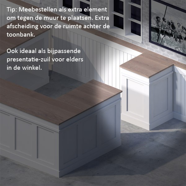 Heb je specifieke wensen? Wil je het net iets anders? Ook deze toonbank kunnen wij op maat leveren. Wij produceren iedere balie op bestelling, en het maakt voor ons weinig uit of dit een standaardmaat of een afwijkende maat is. Vandaar dat bij ons maatwerk niet duurder is dan een standaardmaat. Als de winkelbalie groter wordt zal hij uiteraard ook iets duurder zijn, maar wordt hij kleiner kan hij zelfs goedkoper worden. Meer of minder materiaal en productietijd zullen we doorrekenen, maar voor het aanpassen van een tekening of ontwerp rekenen wij niets.